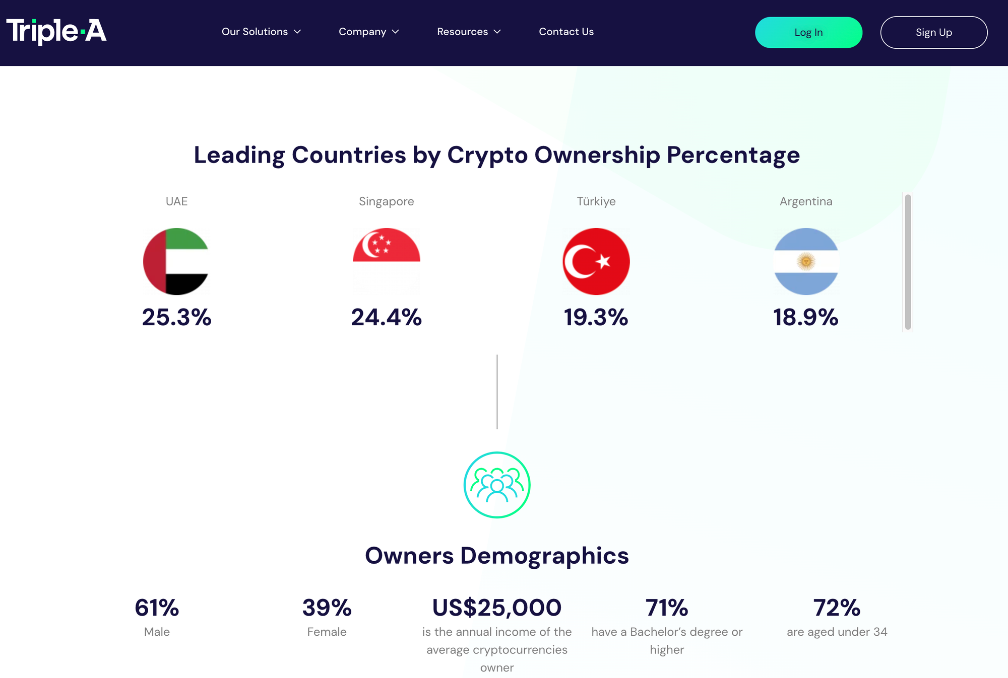 Démographiquement, le plus grand nombre de détenteurs de cryptomonnaies se situe dans la tranche d'âge de 25-34 ans, représentant 34% du total, suivi de près par la tranche d'âge de 35-44 ans avec 31%. L'écart entre les sexes se réduit, les femmes représentant désormais 39% des détenteurs de cryptomonnaies, contre 61% pour les hommes (Triple-A ).