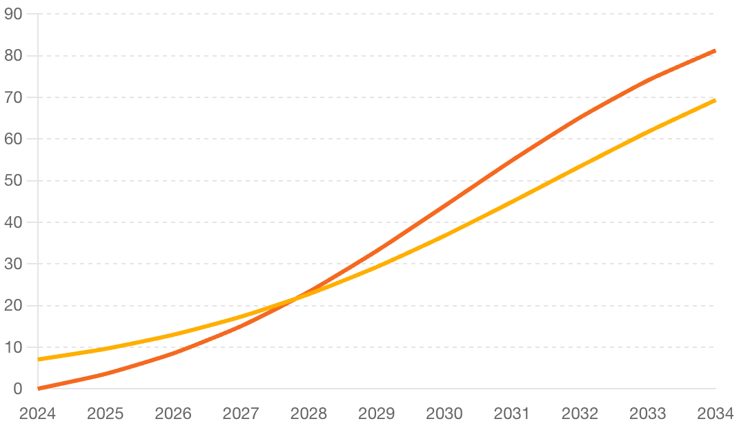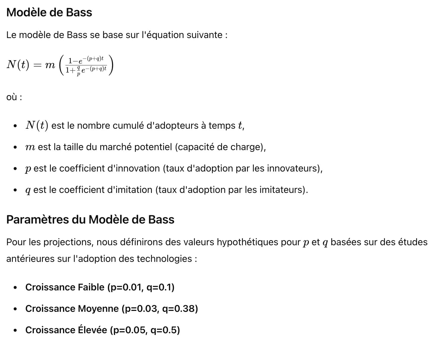 Le modèle de croissance logistique classique est souvent utilisé pour modéliser l'adoption des technologies. Le modèle de Bass est une alternative populaire pour modéliser l'adoption des nouvelles technologies, qui prend en compte à la fois les adopteurs innovateurs et les imitateurs. J'ai sollicité ce second modèle pour projeter l'adoption à 10 ans.
